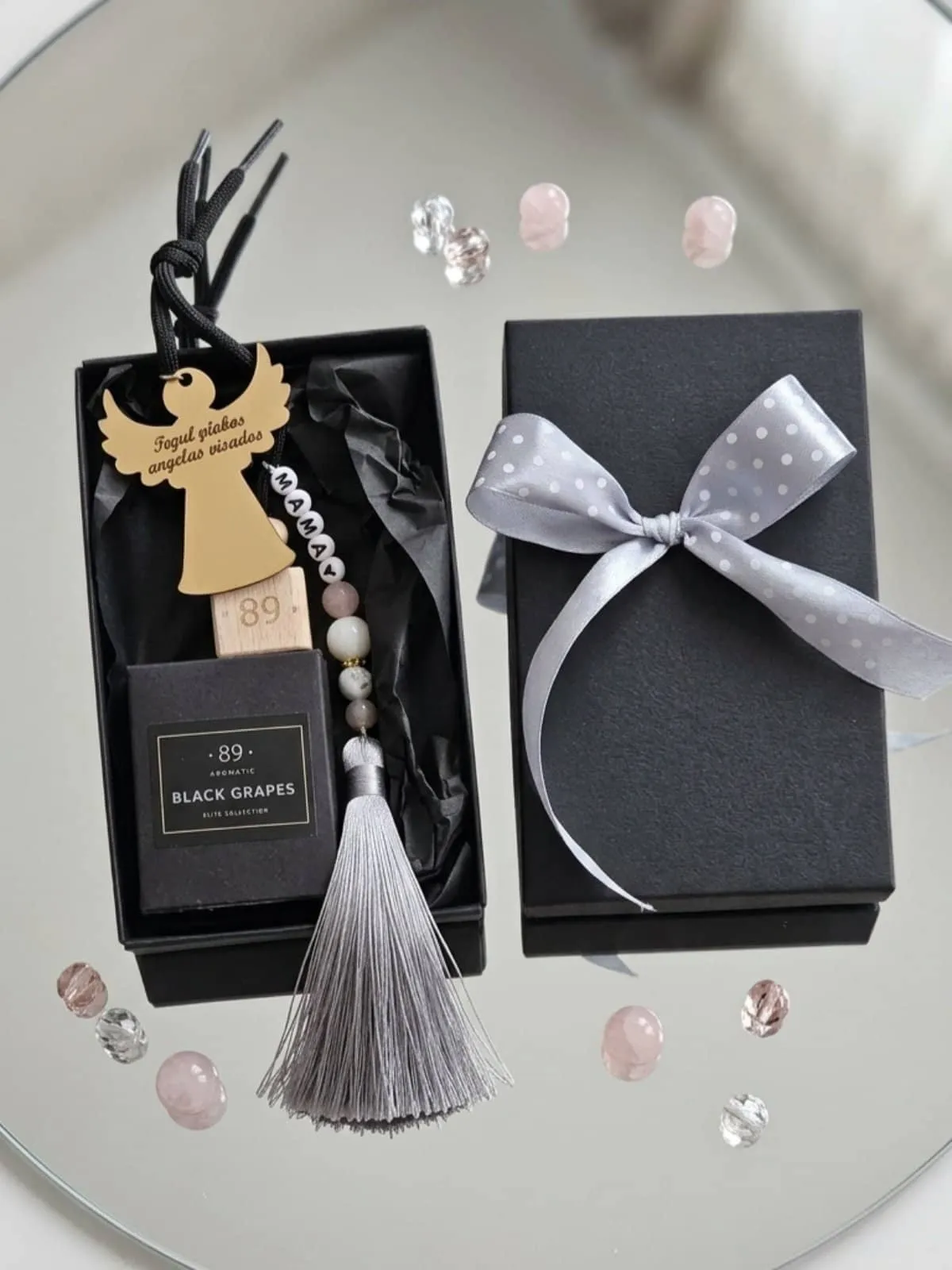 Svarbu: Kadangi kiekvienas gaminys kuriamas individualiai, smulkios detalės ar pakabuko elementai gali nežymiai skirtis nuo pavaizduotų nuotraukoje, priklausomai nuo turimų likučių. Nuotraukoje matomas kvapas taip pat gali skirtis nuo Jūsų pasirinkto varianto.