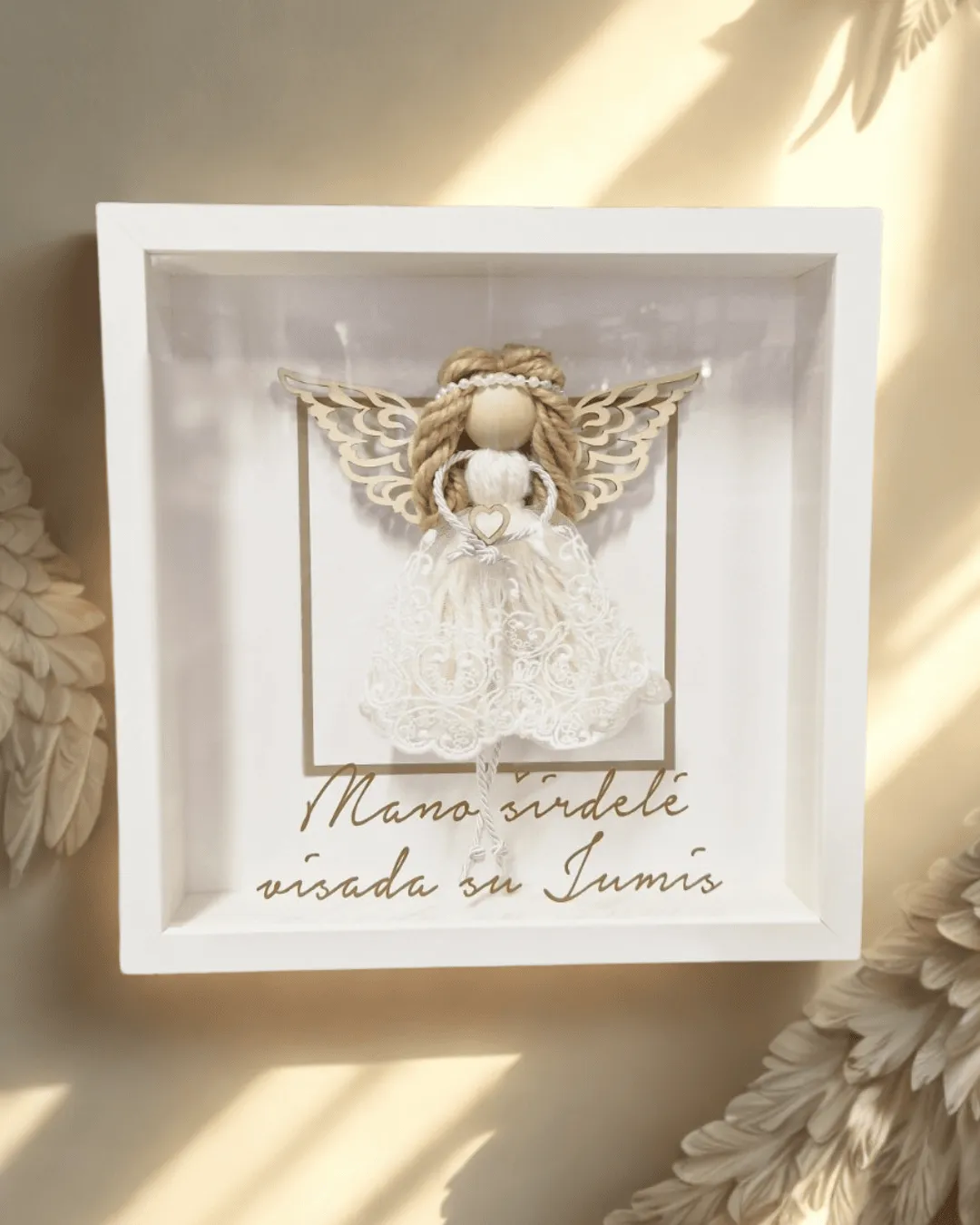 Rankų darbo rėmelis su angeliuku – švelni ir prasminga dovana krikšto tėveliams, tėveliams ar seneliams. Mediniai ažūriniai sparnai, nėrinių suknelė ir natūralūs atspalviai suteikia jam elegancijos. „Mano širdelė visada su Jumis“ – subtili padėka ir ryšio simbolis, darantis dovaną jaukia ir itin asmeniška. Dera prie bet kokio interjero.